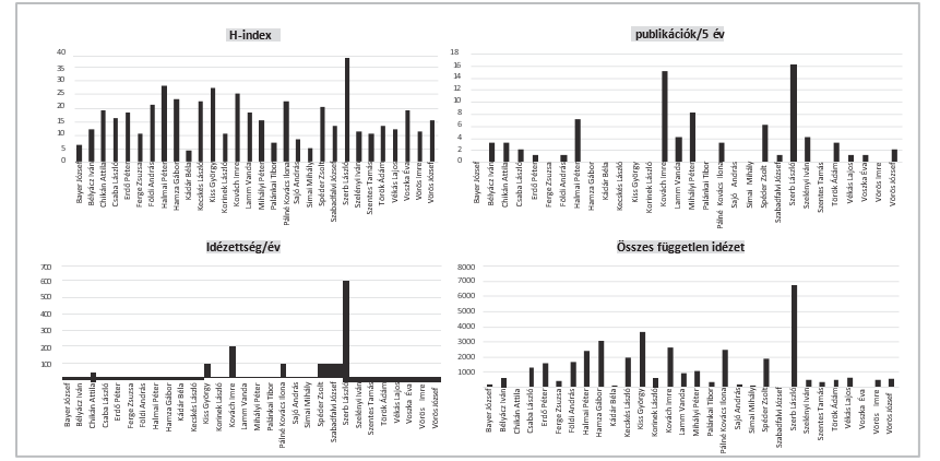 Az elemzéshez továbbra is a www.scientometrics.org tudományos projekt kerül alkalmazásra, amely számos nemzetközi publikáción alapszik.11 A cél, hogy az akadémikus kutatókat, illetve tudományterületeket egymással objektív módon vessük össze azáltal, hogy minden egyes kutatót egy közös referenciaadatbázishoz hasonlítunk, amely a hasonló korú, és egyező tudományterületen aktív magyar kutatókat tartalmazza. 31 magyar jogász- és közgazdász akadémikusra vonatkozik az elvégzett elemzés. A könnyebb lekövethetőség végett a módszertant és a kapott eredményeket táblázatos formában teszem közzé.12