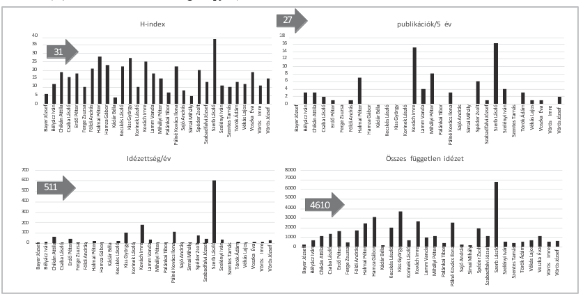 Ugyanígy, a természet- és alkalmazott tudományok esetében (kivéve a matematikusokat) a vezető szerzős (első és utolsó helyű) nemzetközi rangú közlemények súlyozottan beszámítottak, a közgazdaság- és jogtudományok, valamint a társadalom- és bölcsészettudományok esetében azonban – az eleve alacsony teljesítmény okán - a bármilyen szerzős (nem lehet első helyet figyelembe venni, mert az alacsony teljesítmény okán értelmezhetetlenek – áttekinthetetlenek lennének az ábrák) publikációk az utolsó öt évből.