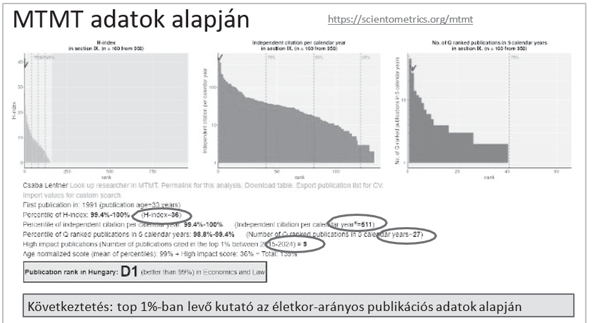 Az MTA IX. osztály jogász és közgazdász levelező és rendes tagjainak Hirsch Indexét, az utolsó öt év alatt teljesített publikációinak éves átlagszámát, az egy évre jutó idézettségét és az összes független idézettségét összevetettem a sajátommal. Megállapítom, hogy 2020-2024 (2025) időszakában, amikor a pályázatom elbírálás alatt állt, az valamennyi jogász és közgazdász akadémikus tudományos teljesítményét messze meghaladta.