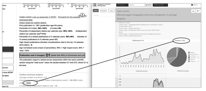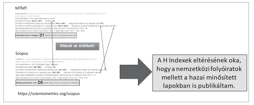 Kiegészítés: A 10. és 11. ábrákban lévő akadémikusi és saját numerikus adatoknál, amelyek az MTMT alapján kerülnek bemutatásra lényeges, hogy az MTMT szerzői adatlap és az összefoglaló táblázat adatai eltérhetnek. A bemutatott számítások a kedvezőbb adatokkal kalkulálnak. Lásd a saját, 15. ábrában lévő, átvett MTMT adatokat, a jobb oldalon. A baloldali rész a scientometrics.org adatbázis alapján számítottak. A Scopus-on belül is biztos, hogy van eltérés attól függően, hogy API-val kérjük le az adatot, vagy a honlapon nézzük meg. Kisebb eltérés tehát így az MTMT esetén is lehet ugyanezen okból.