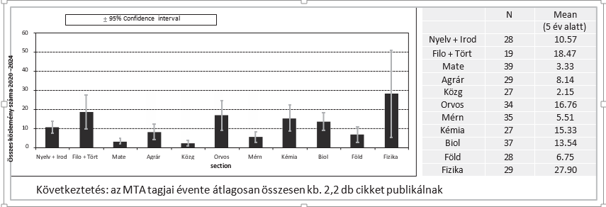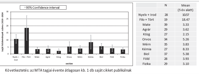 A 2. számú ábrán a jobboldali oszlop mutatja az öt évre vonatkoztatott átlagot, tehát az értéket 5-el kell elosztani, hogy az éves átlagot lássuk. Ez alapaján az MTA tagjai (a 11 osztály egészére vetítve) évente átlagosan kb. 1 db saját cikket publikálnak.