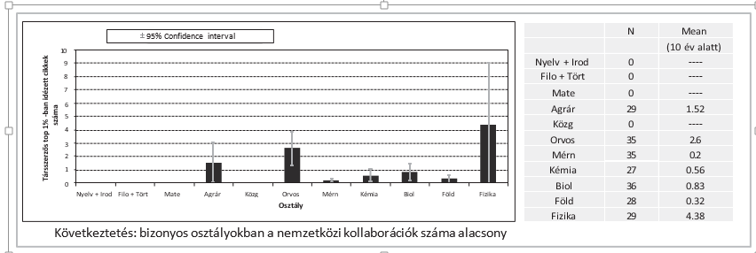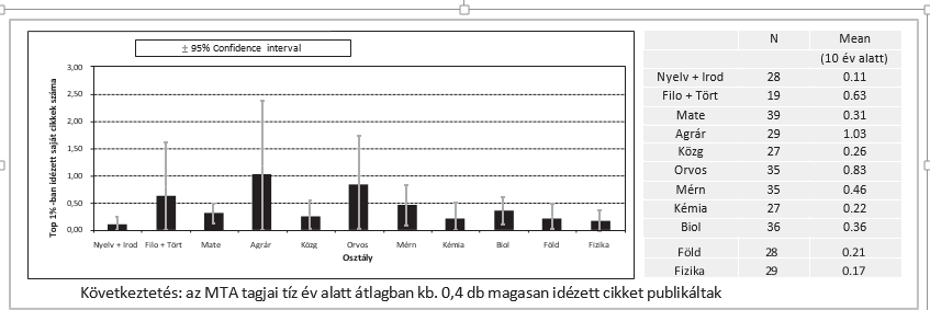 A 4. számú ábrán az N mutatja, hogy hány magasan idézett cikk volt az adott osztályban, a mean pedig, hogy mennyi a tételszám egy akadémikusra. A mean-ok átlaga 0,4 – ami azt jelenti, hogy egy akadémikus 10 év alatt átlagosan 0,4 (darab) ilyen magas szintű cikket írt.
