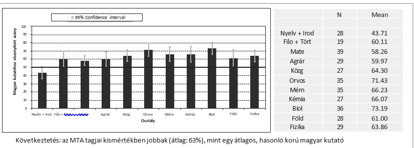 Az akadémiai osztályokba sorolt különböző tudományterületű rendes és levelező tag akadémikusok többi magyar kutatóhoz mért teljesítményét illusztrálja a kimutatás, amely szignifikáns többletet nem mutat. Tehát az akadémiai osztályok akadémikusainak teljesítménye az un. országos, teljes tudósállomány átlagától alig tér el.