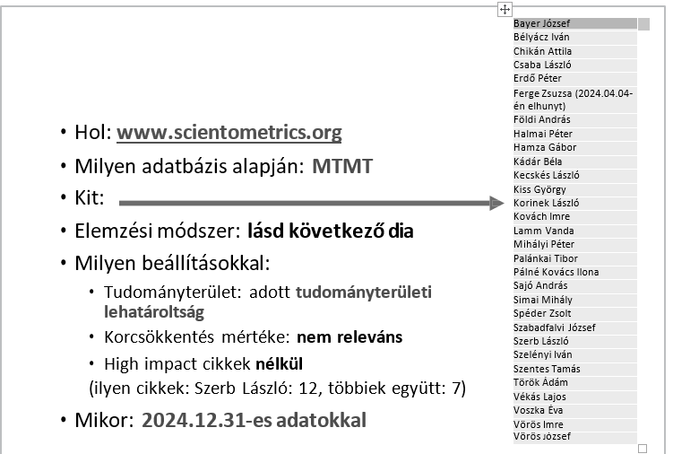 - Az aktualitásra és a teljeskörűségre tekintettel az értékelésben szerepel a 2024-ben elhunyt Ferge Zsuzsa professzor, de a 2025 nyár elején levelező taggá választott Szerb László is, aki a tudományterületének legkiválóbb kutatója. További elemzések alapját képezheti, hogy miért csak 2025-ben választották be az akadémikusi körbe.