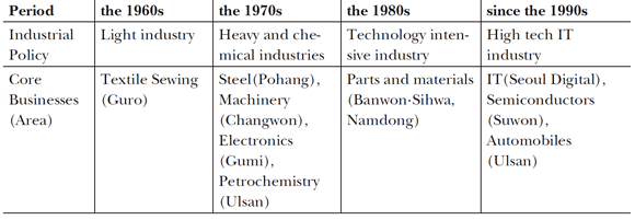 Cluster policies allow us to check and diagnose the interrelationships and bottlenecks, while keeping the entire picture in sight. First, individually implemented policies are generally less than optimal, and the optimum conditions can be achieved through policies generated within the cluster system. Secondly, cluster policies do not focus on the individual constituents but on the networks built of them. While it is important to support the individual members so that they can solve urgent problems and increase competitiveness, cluster policies place more emphasis on vitalizing interconnected networks created through the collaboration of large companies and SMEs. Thirdly, cluster policies encourage active participation by private sectors, as well as central and local governments in their planning and implementation. During the past 50 years of economic growth since the Korean War, the Korean government has implemented industrial location policies, which are similar to clusters. Industrial locations refer to geographical area where companies gather to conduct business activities. Some examples are the Transition of the Industrial Location.8