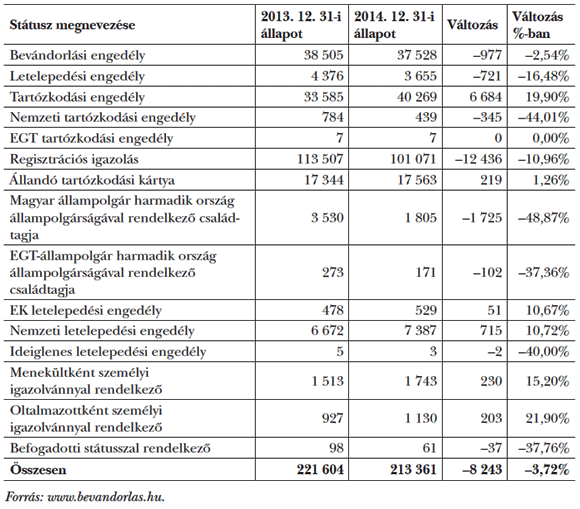 Végül nézzük meg, hogy milyen nagyságrendű azoknak a külföldieknek a száma, akikről eddig szó volt. A Bevándorlási és Állampolgársági Hivatal adatai szerint 2014. december 31-i állapot szerint Magyarországon 213 361 főt tartottak nyilván, mint bevándorolt, letelepedett, illetve három hónapot meghaladó tartózkodó.